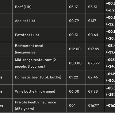 Slovenia: Covered by mandatory health insurance (5.96% of pension = €89.60/month) *UK: Private health insurance for over 65s costs around £2,000 per year (€167/month)